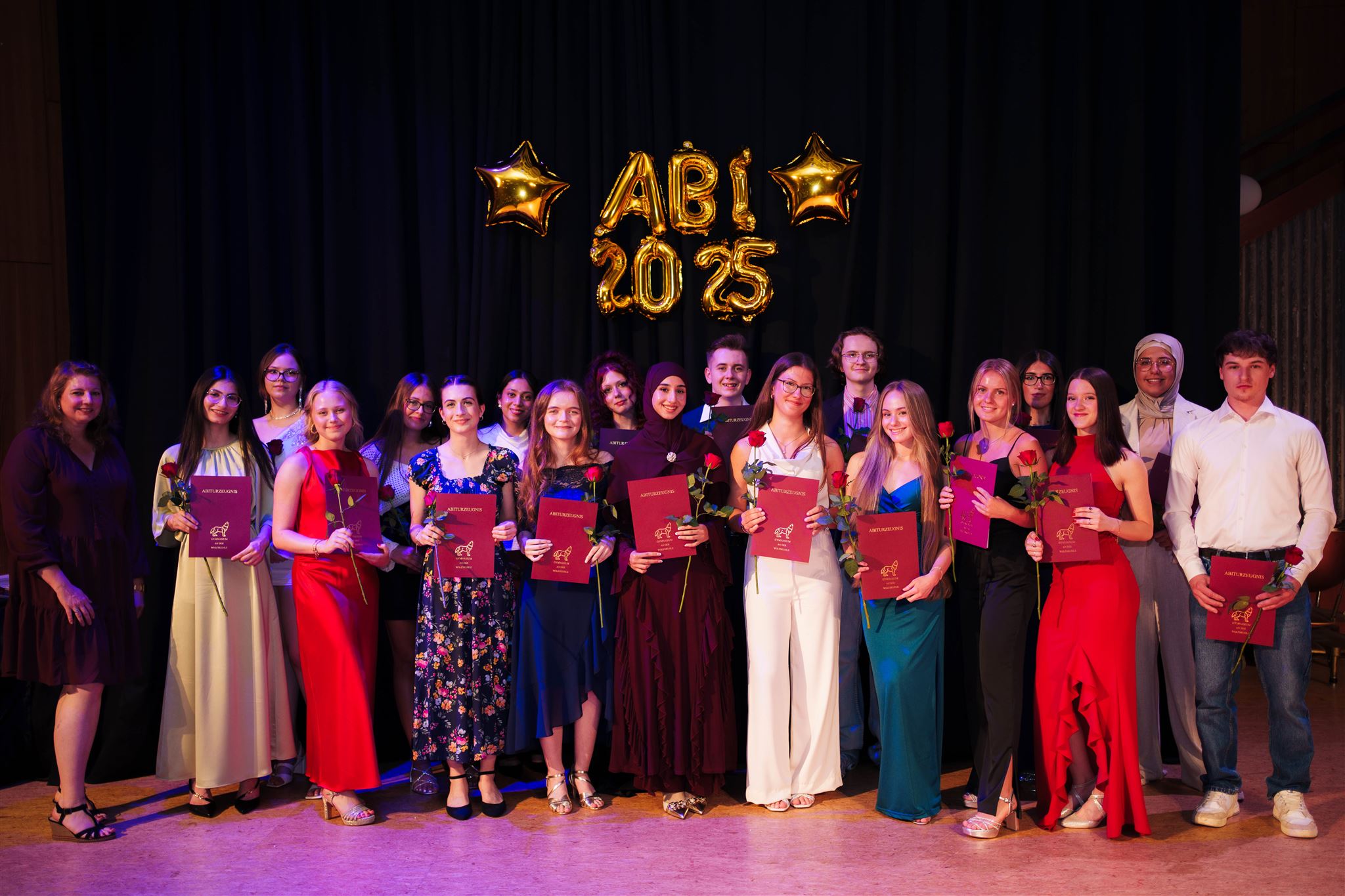 In diesem Jahr haben an der Wolfskuhle 86 Schülerinnen und Schüler erfolgreich die Abiturprüfung abgelegt, davon 26 mit einer 1 vor dem Komma. Fünf Schülerinnen und Schüler haben das bilinguale Abitur erreicht: Lujane al-Rabi’i, Carolina Bode, Franka Bode, Bayan Darmoush und Zhulya Tayeb.