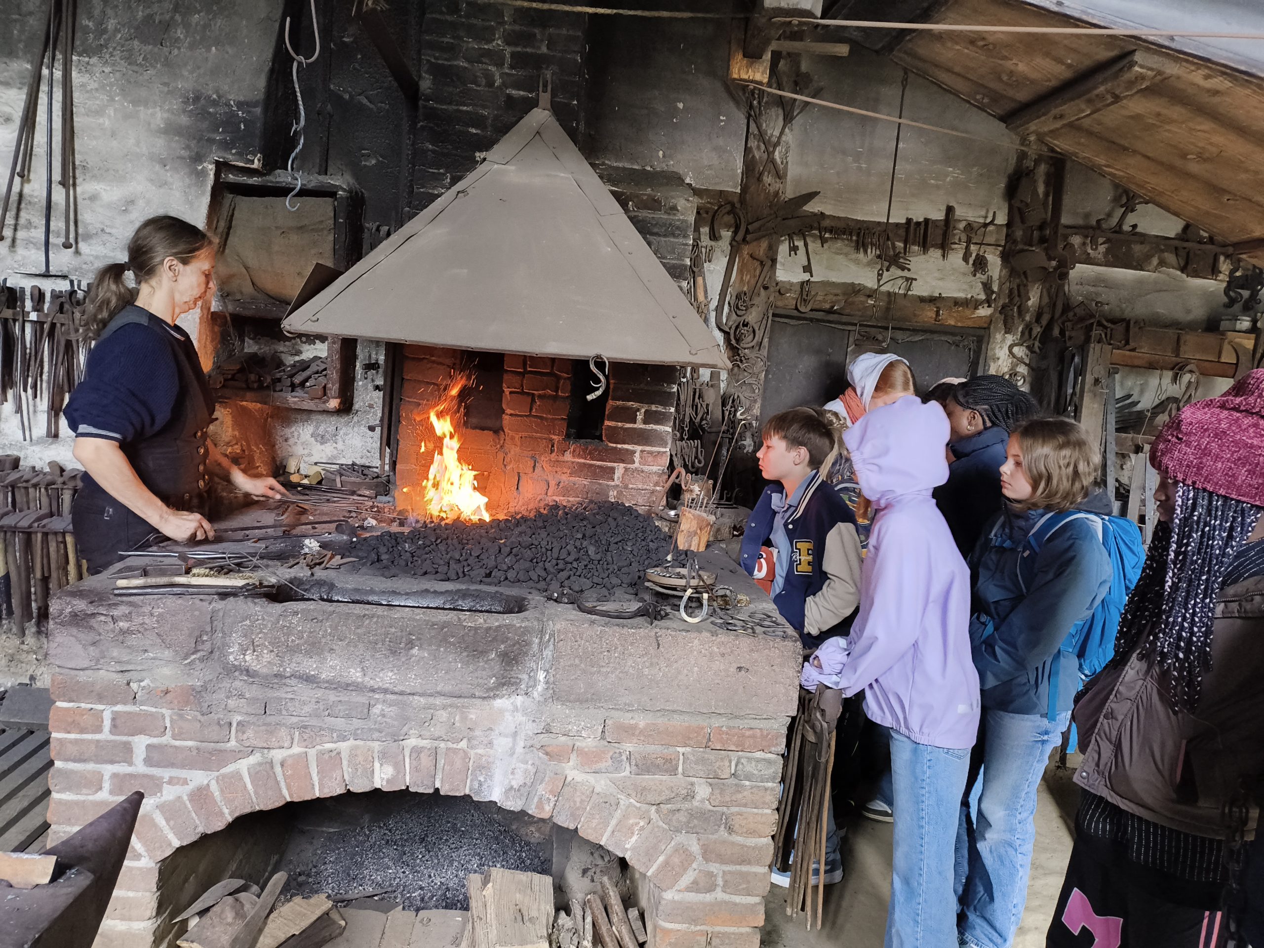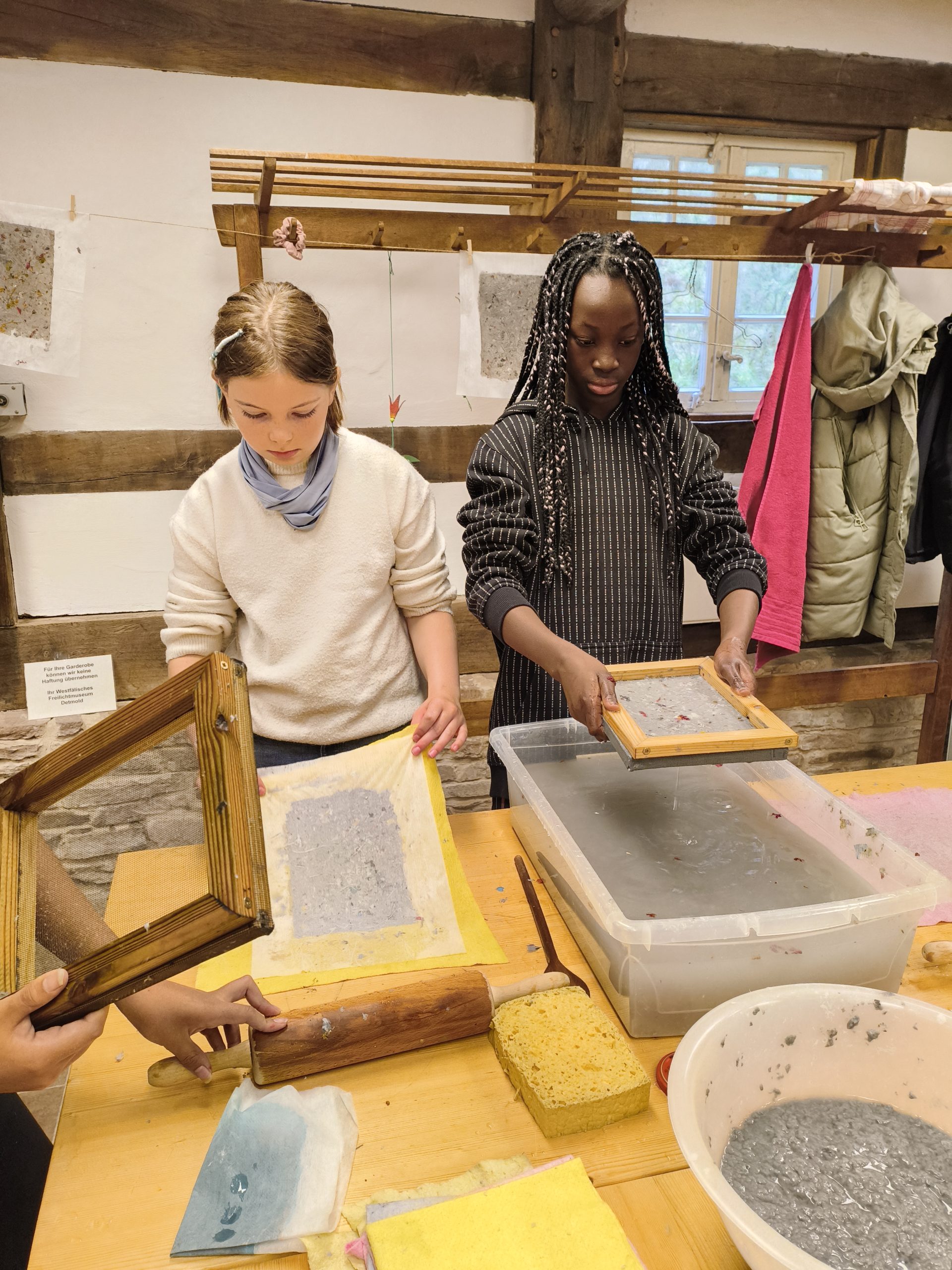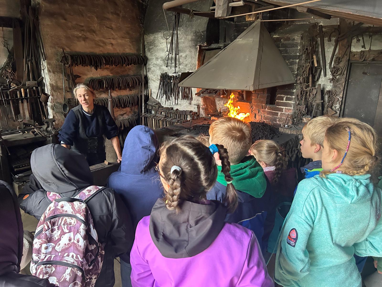 On Thursday we had the second workshop: paper making. First we tore old newspapers into little pieces, then we mixed them with water and made beautiful paper with flowers or confetti inside. It was very creative! Later we visited the museum and saw many old houses, a bakery and even a blacksmith at work. The blacksmith was really cool! She even made a heart from metal just for our class! In the afternoon the children who wanted to went by horse-drawn carriage through the museum. In the evening we had our class council and then our disco!