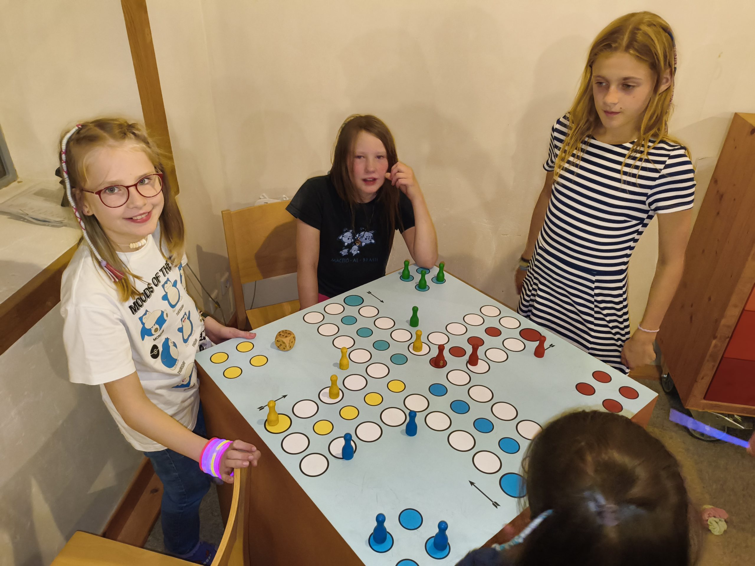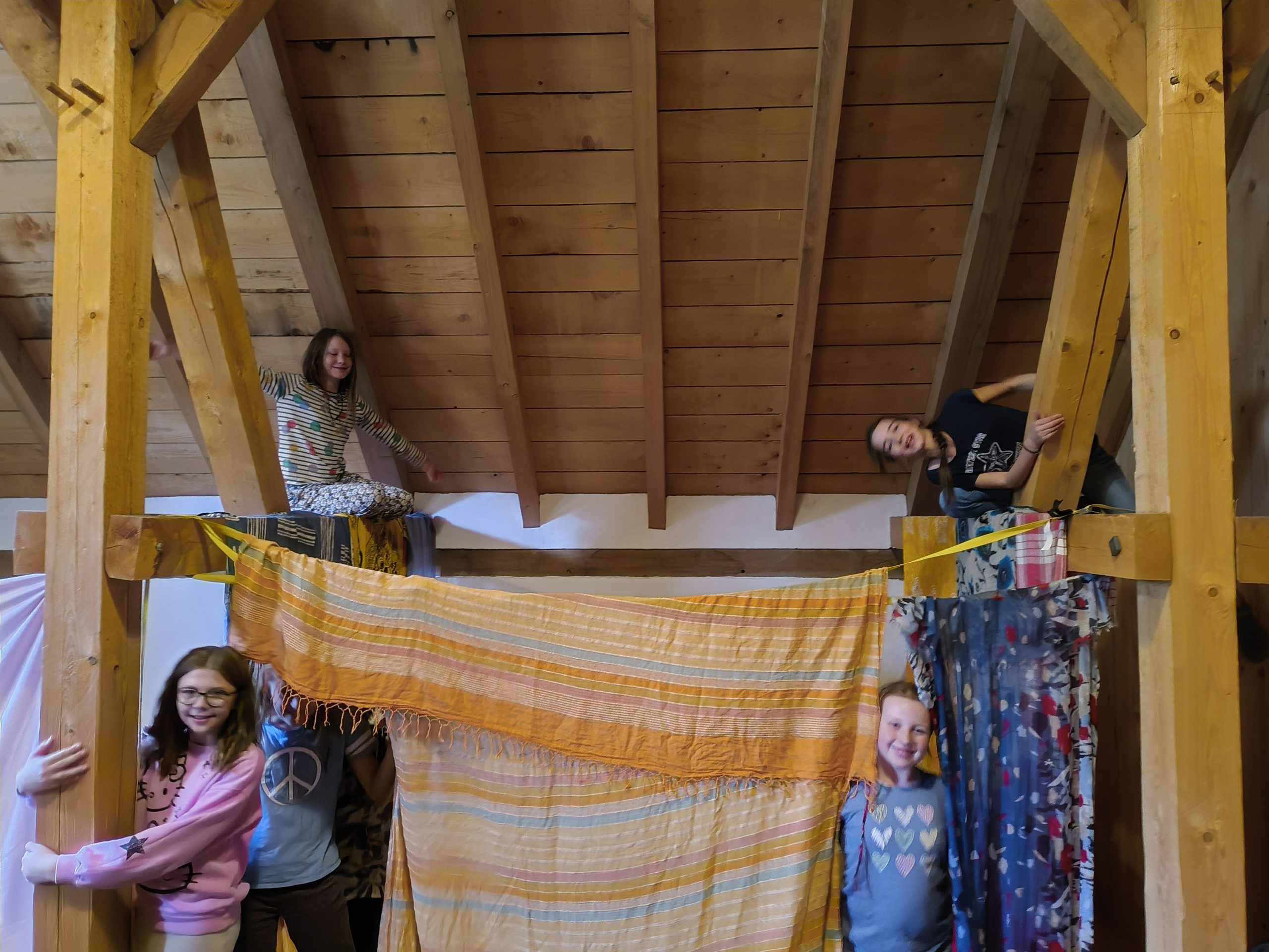 On Monday morning we met at school at 8:45 a.m. and said goodbye to our parents. The bus came at 9:30 a.m., and after a long drive we arrived at the museum. We had to walk about two kilometres to our house. When we arrived, we unpacked our things, made our beds and explored the place. Some children even built a tipi out of branches and mown grass. It took a long time and a lot of teamwork, but in the end it looked amazing! Everyone was very proud because we built it completely on our own. In the evening we had our first class council and went to bed very tired but happy.
