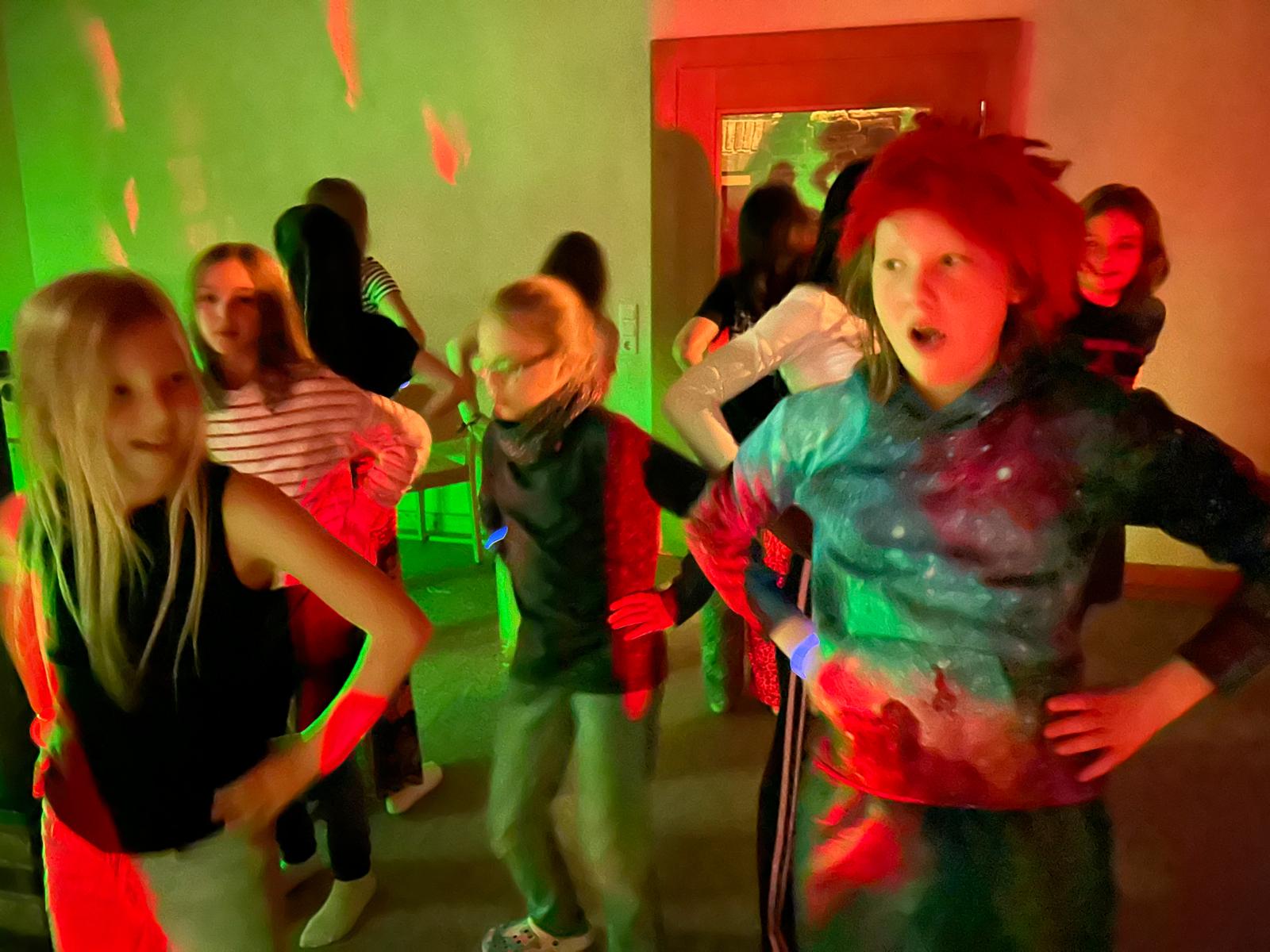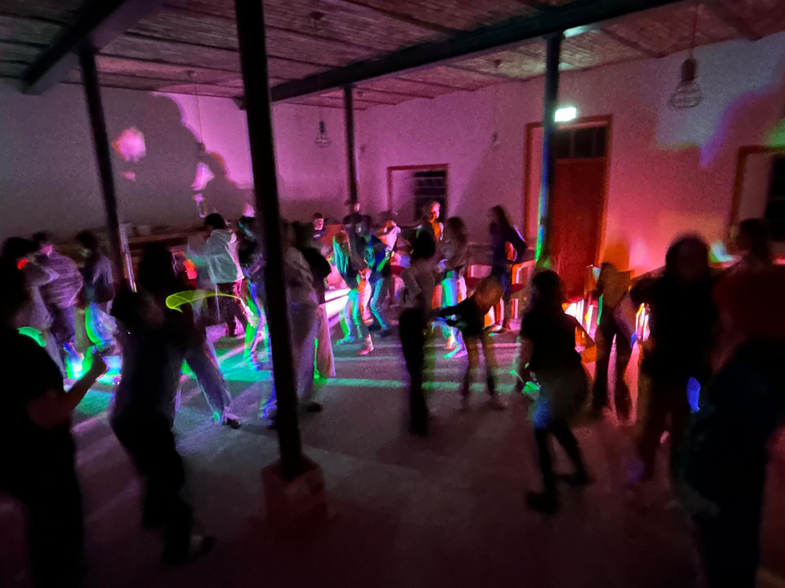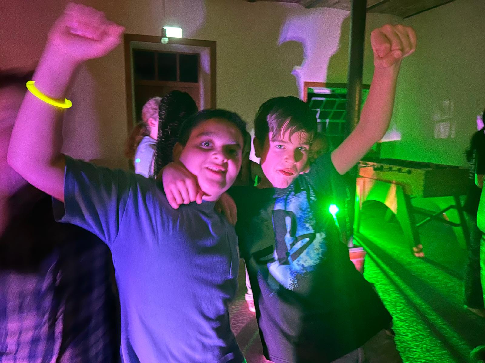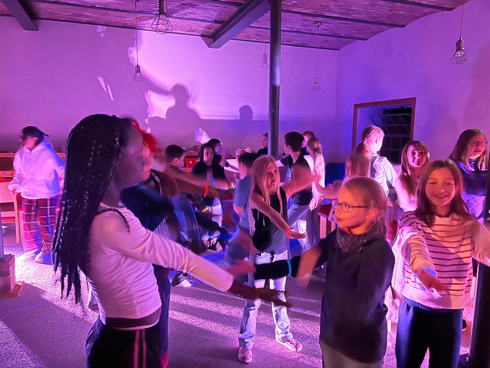 Before we could enter the disco, we all got glowing bracelets from the “security team”. Mr Rüster was our famous DJ Rainbow Rüster and played songs like Shake It Off by Taylor Swift and It’s Raining Tacos. There were snacks, lemonade and lots of dancing. We even made a circle for dancing with the whole class! Everybody had fun and laughed a lot. At 11 p.m. the disco was over, and we went to bed tired but happy. Some children still talked about the disco but it was quiet enough to sleep because we were all exhausted from dancing and laughing!