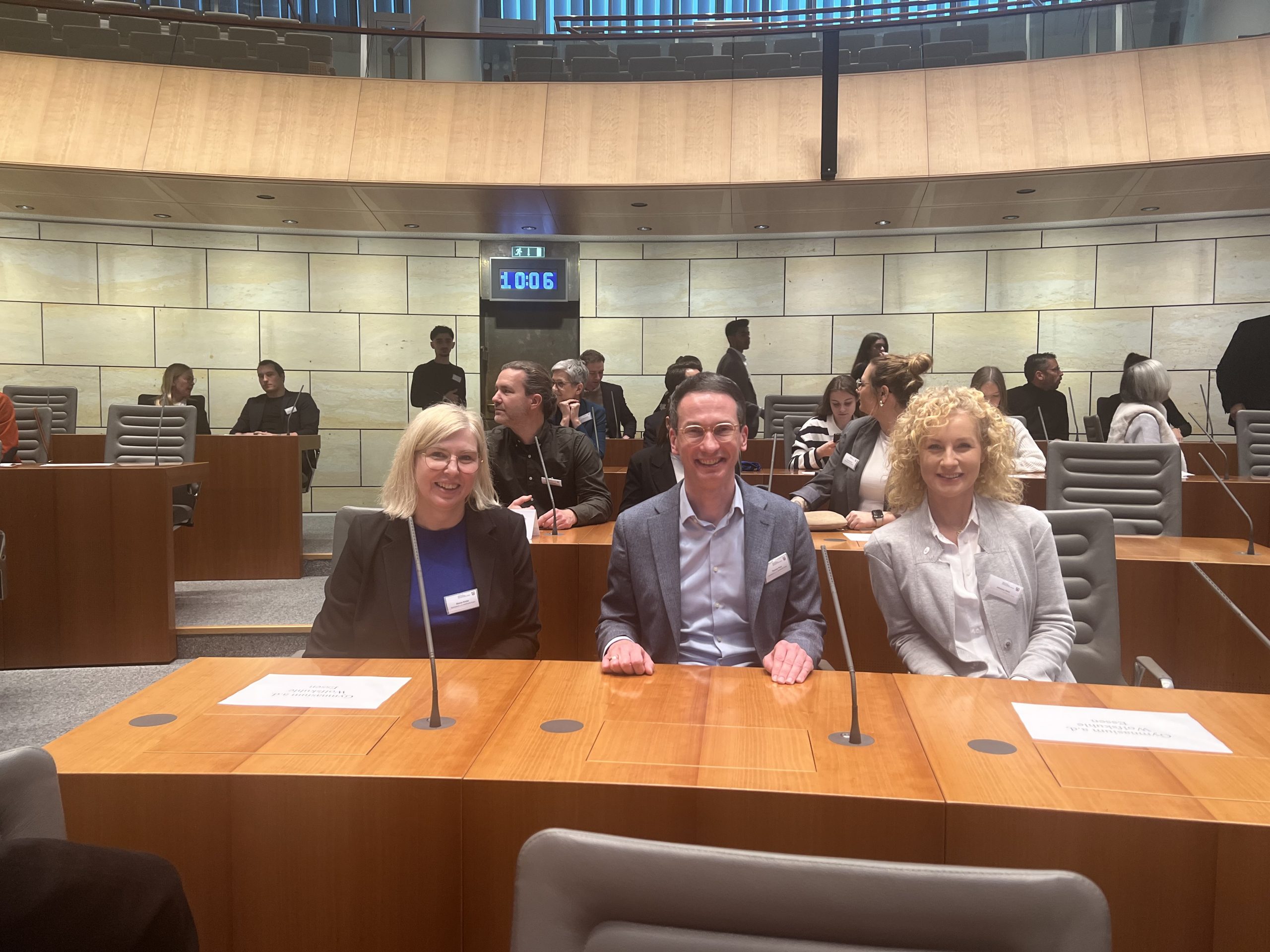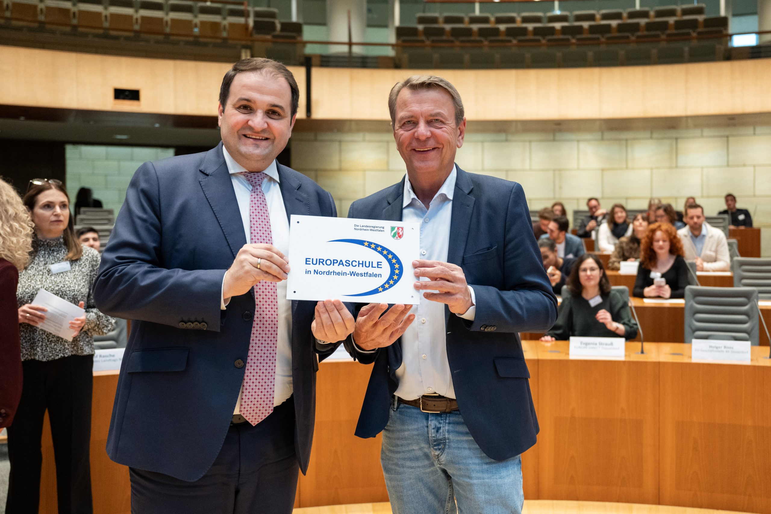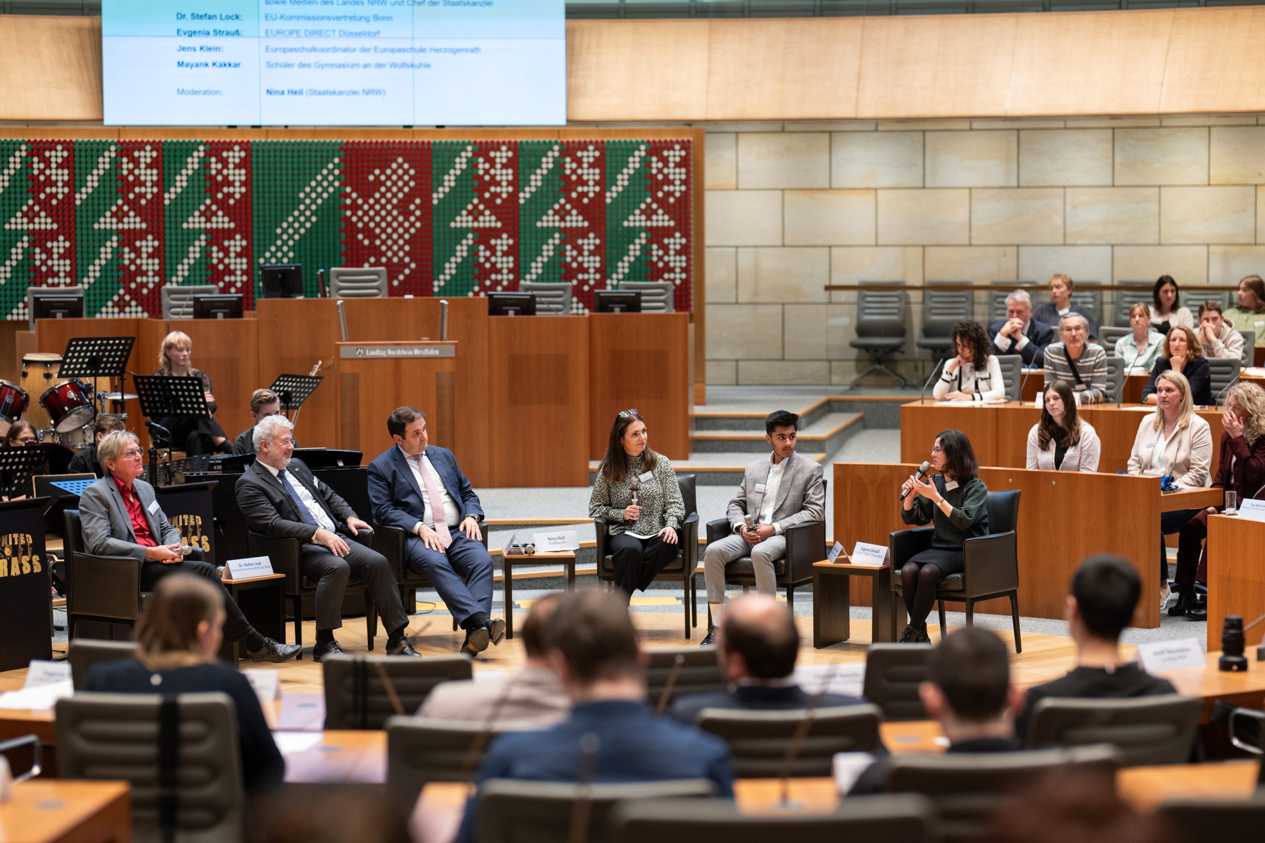 Die feierliche Auszeichnung fand im Plenarsaal des nordrhein-westfälischen Landtags statt. Neben der Ehrung der neuen Europaschulen fand eine Podiumsdiskussion zum Thema „Europafeindlichkeit im Alltag begegnen: Strategien und Verantwortung im Bildungskontext“ statt. An der Diskussion nahmen unter anderem der Minister für Bundes- und Europaangelegenheiten, Nathanael Liminski, und Dr. Stefan Lock, Leiter der Regionalvertretung Bonn der Europäischen Kommission, teil. Besonders stolz sind wir darauf, dass auch unser Schüler Mayank Kakkar auf dem Podium saß und seine Perspektive als Schüler einbringen konnte.