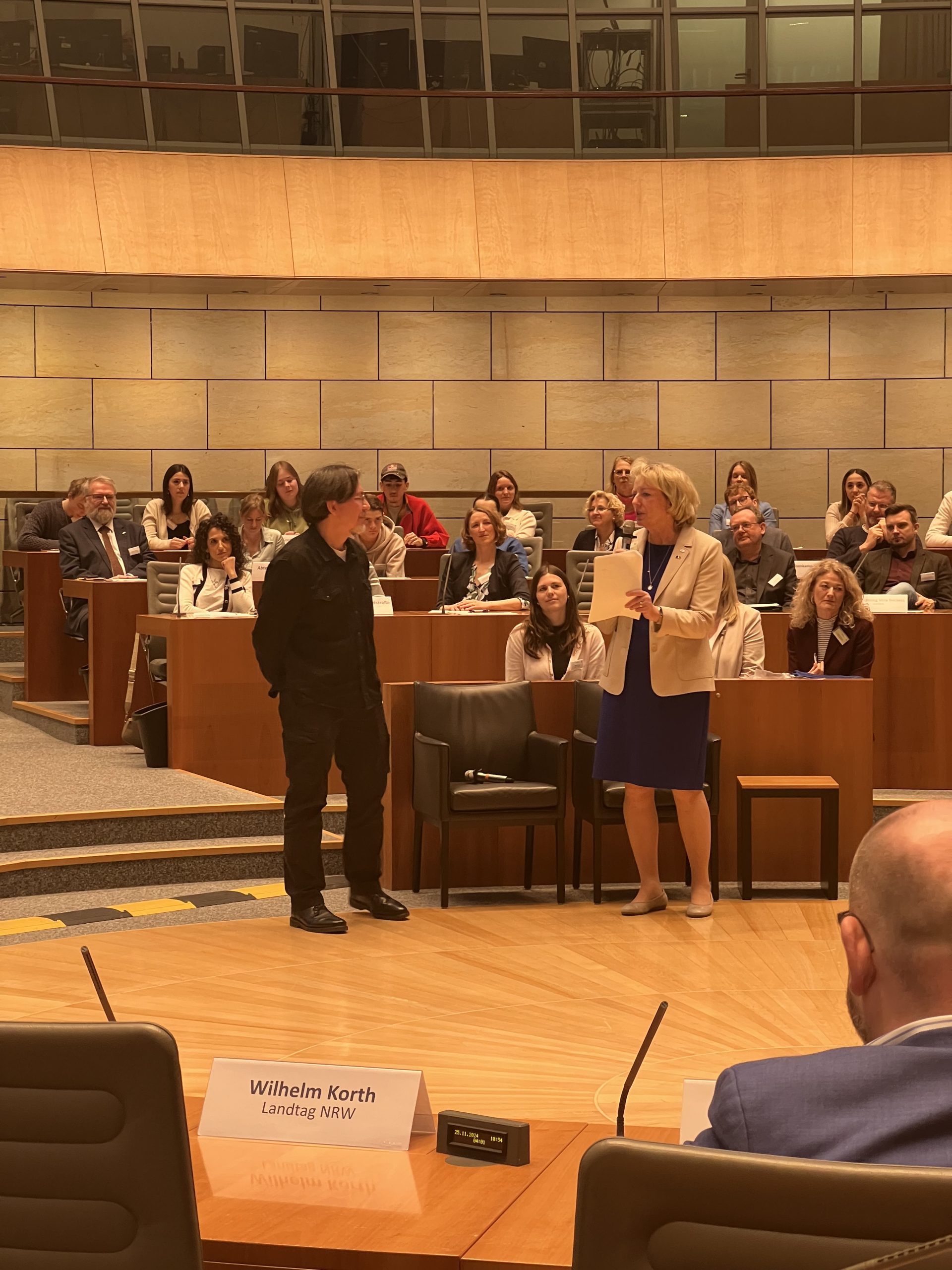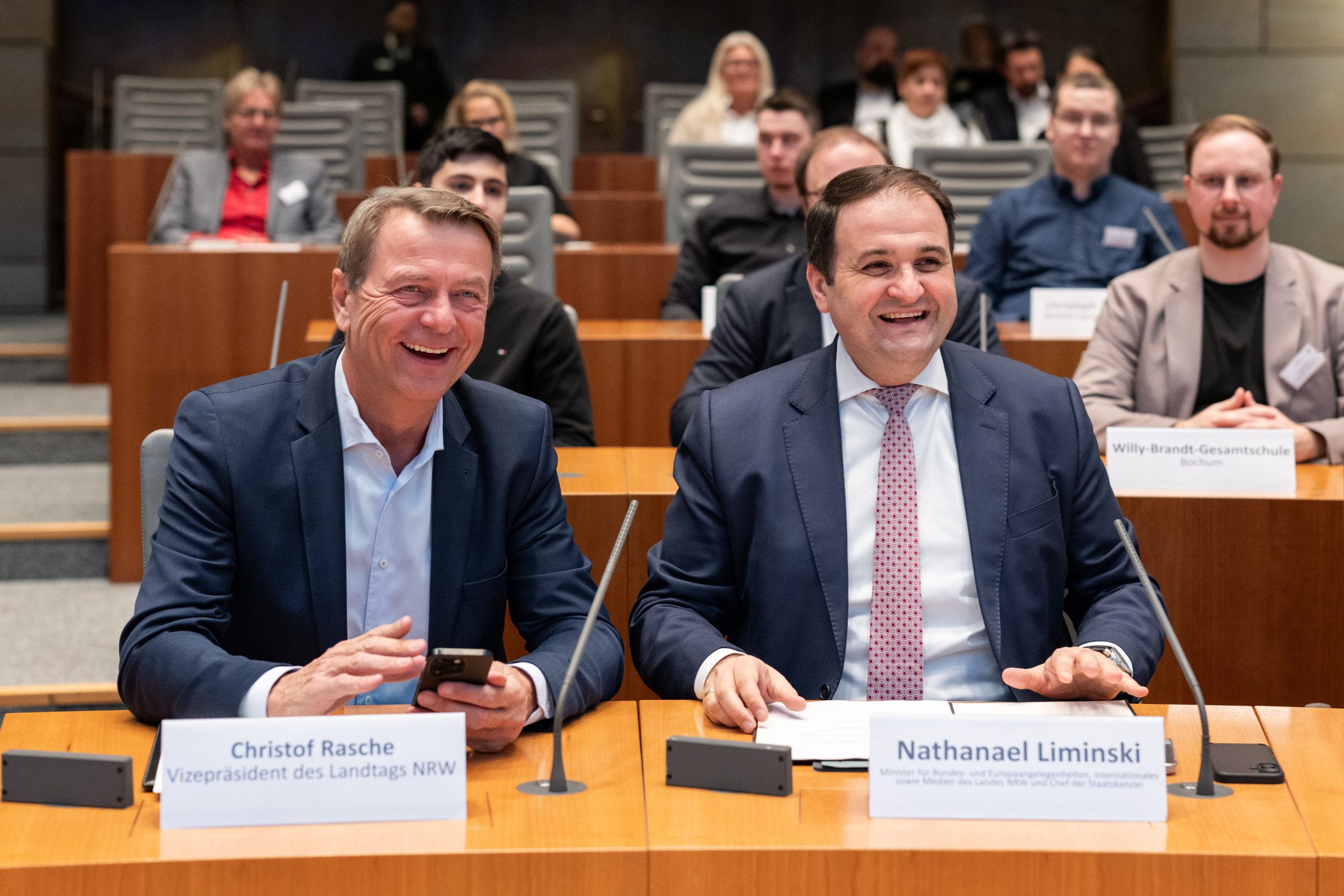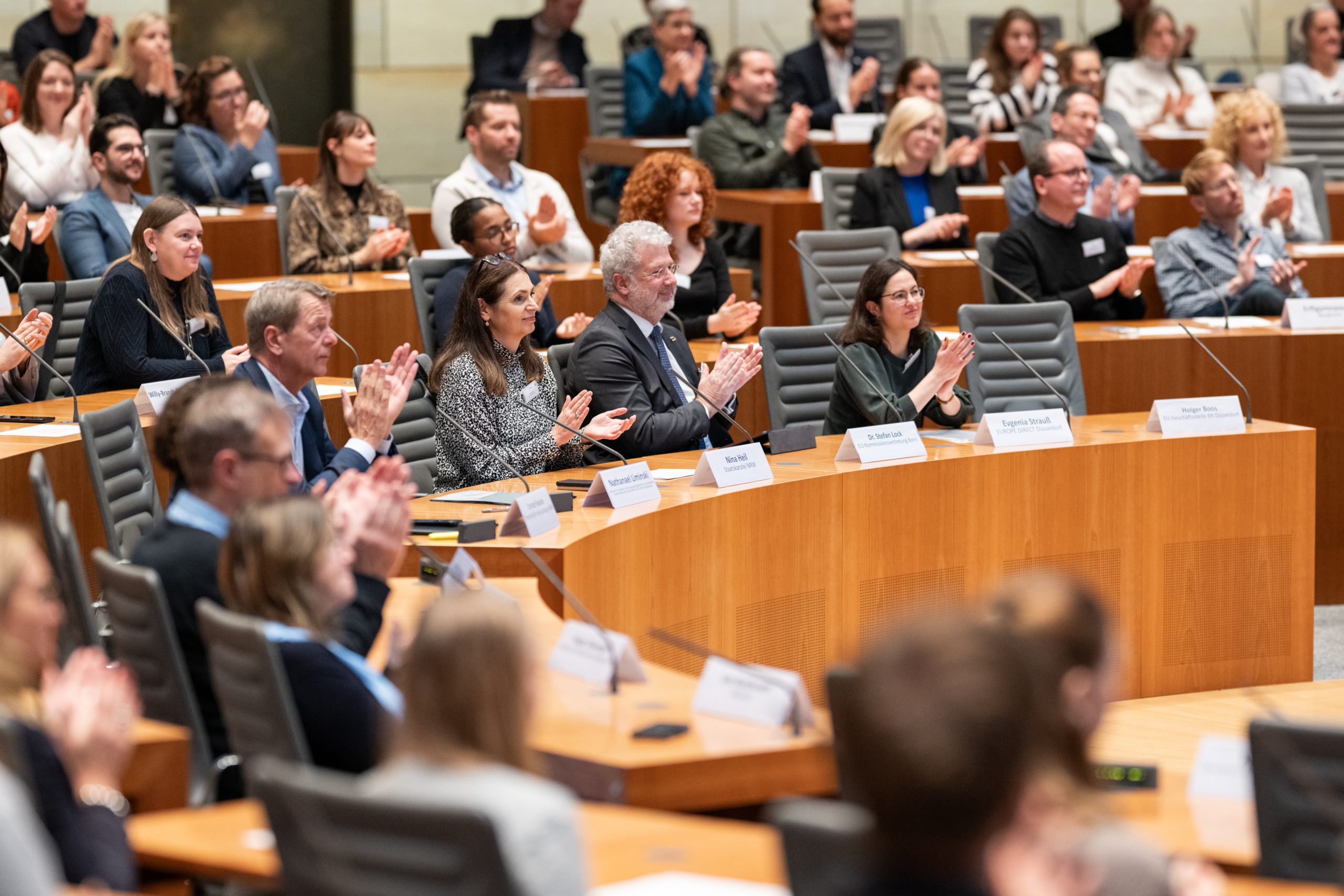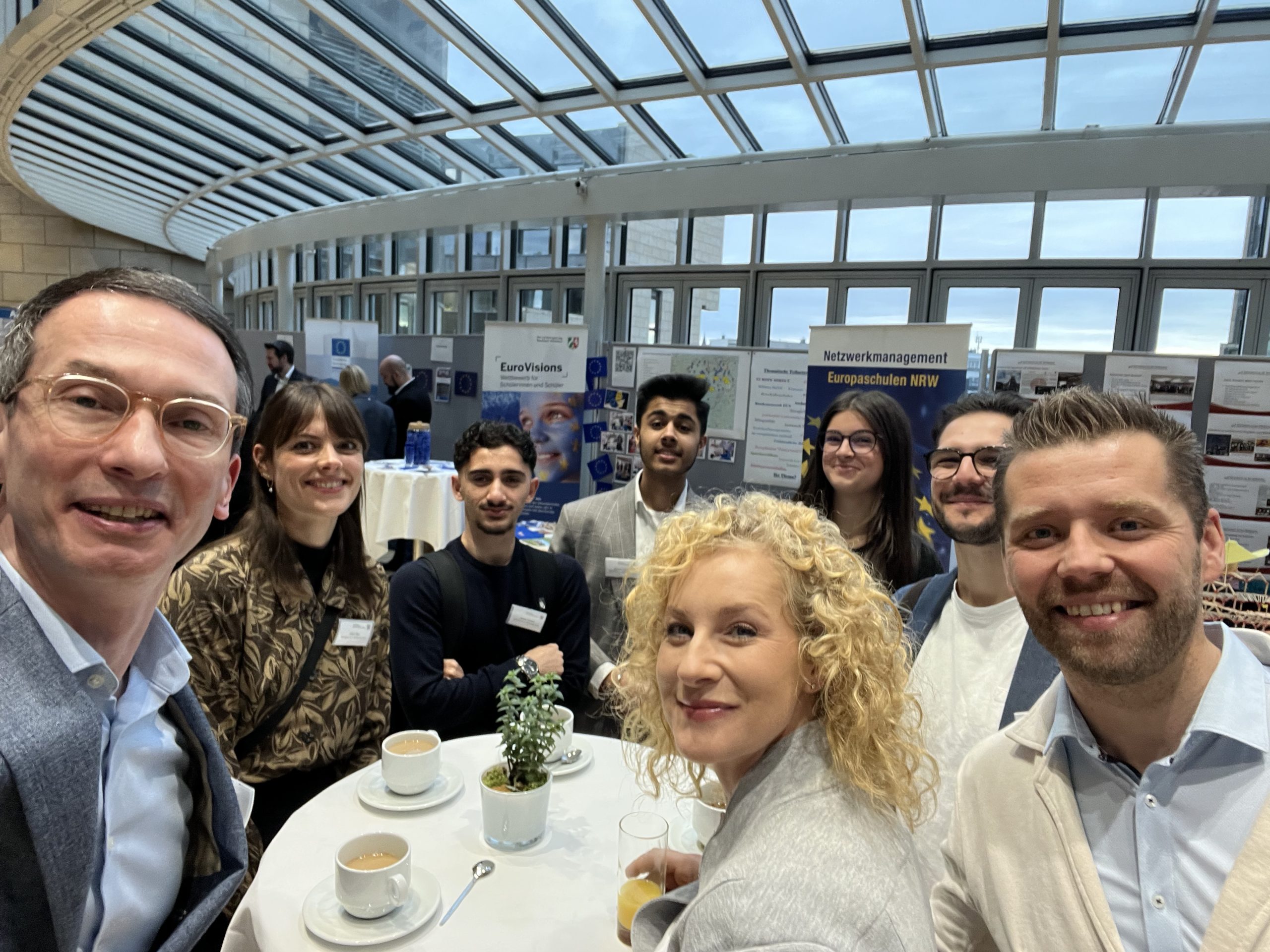 Die feierliche Auszeichnung fand im Plenarsaal des nordrhein-westfälischen Landtags statt. Neben der Ehrung der neuen Europaschulen fand eine Podiumsdiskussion zum Thema „Europafeindlichkeit im Alltag begegnen: Strategien und Verantwortung im Bildungskontext“ statt. An der Diskussion nahmen unter anderem der Minister für Bundes- und Europaangelegenheiten, Nathanael Liminski, und Dr. Stefan Lock, Leiter der Regionalvertretung Bonn der Europäischen Kommission, teil. Besonders stolz sind wir darauf, dass auch unser Schüler Mayank Kakkar auf dem Podium saß und seine Perspektive als Schüler einbringen konnte.