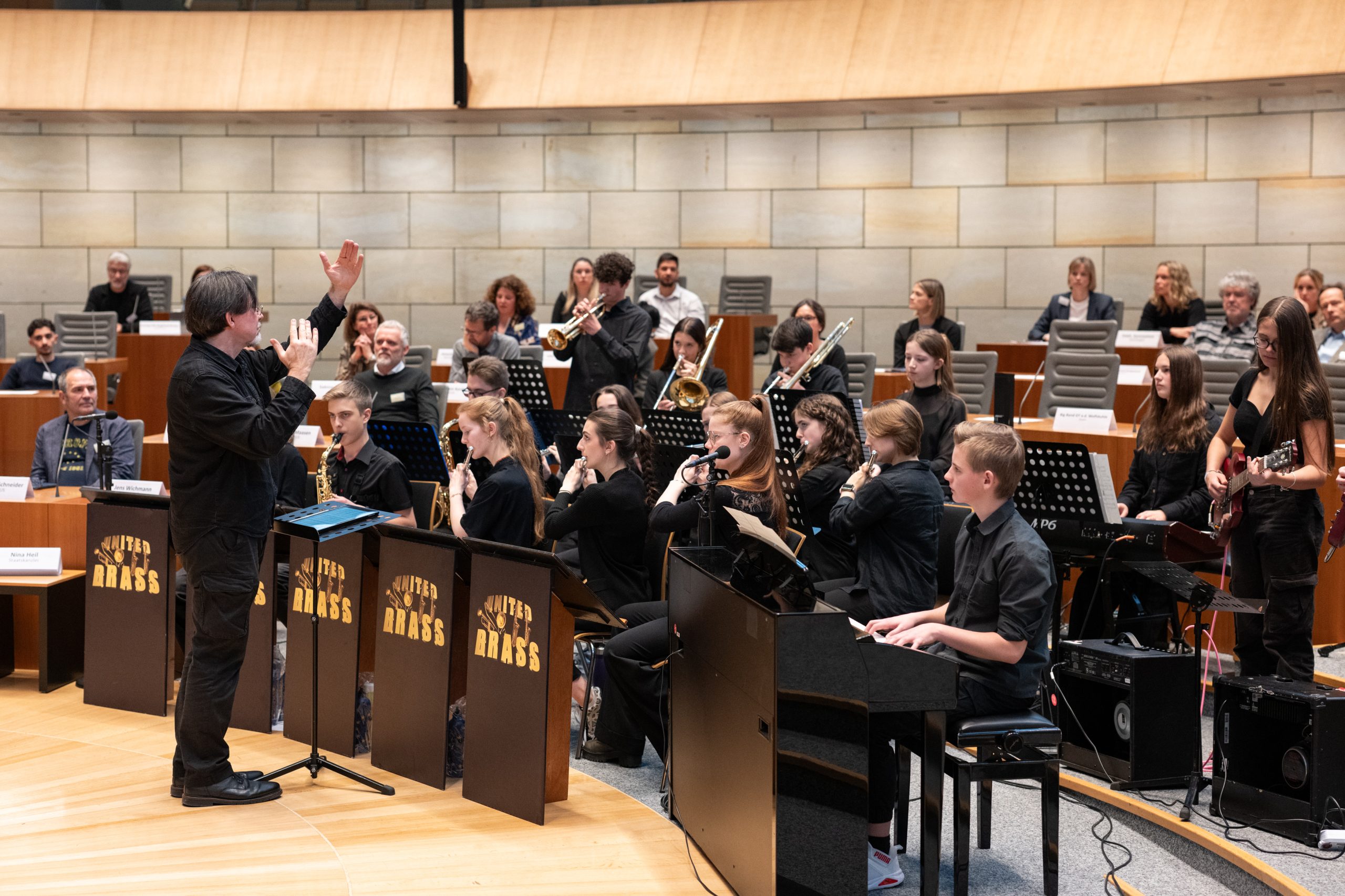 Unsere Schule war mit einer großen Delegation vertreten – im Rahmen der Zertifizierung durften 10 Mitglieder der Schulgemeinschaft teilnehmen, darunter unsere Schulpflegschaftsvorsitzende und unser Schülersprecher. Als das Bildungsministerium erfuhr, dass wir neben unserem Europaschwerpunkt auch einen erfolgreichen Musikschwerpunkt haben, wurde unsere United Brass Big Band eingeladen, die Veranstaltung musikalisch zu begleiten und trug unter der Leitung von Herrn Malan maßgeblich zum Gelingen der Feier bei.