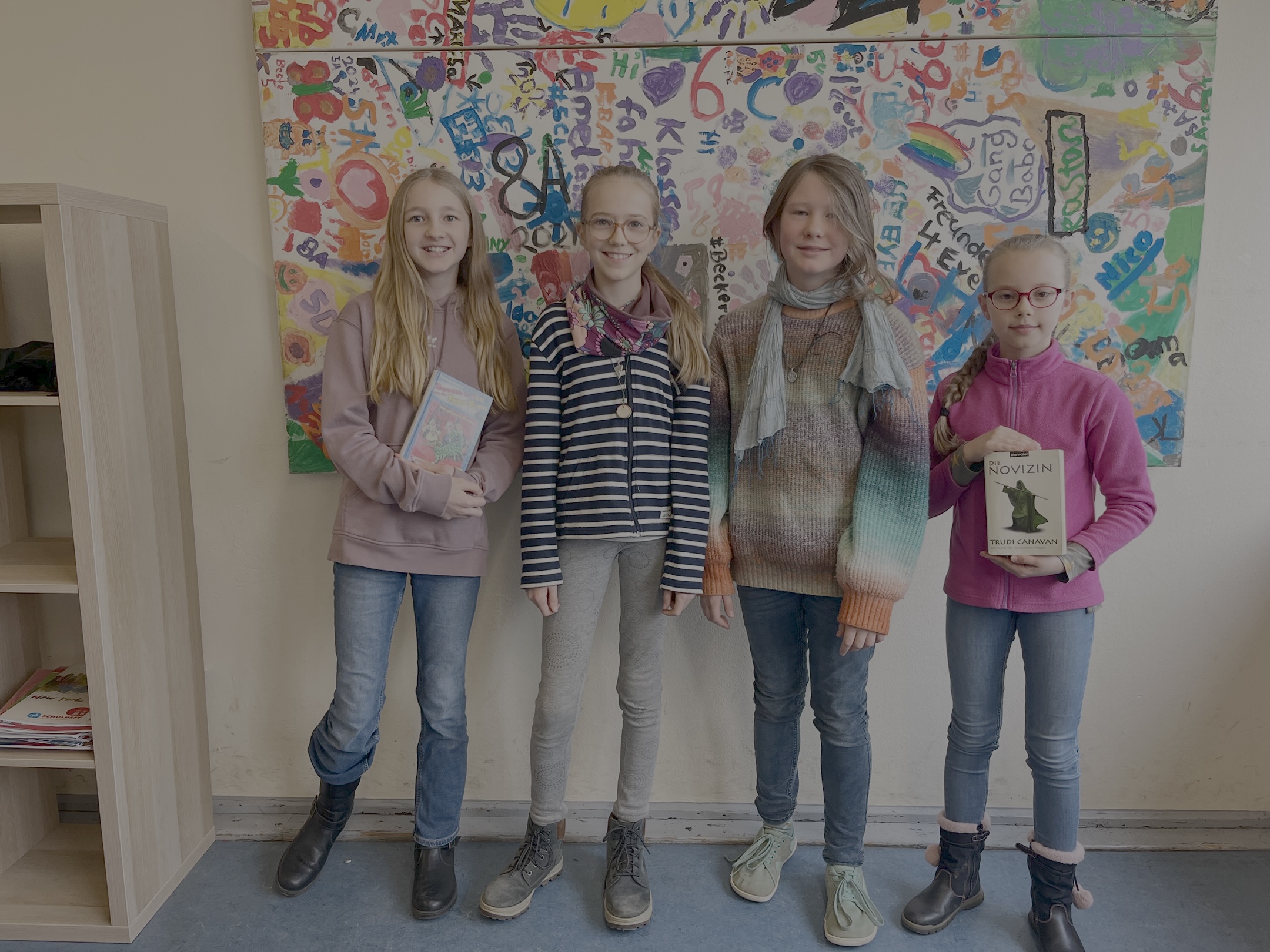 Mathilda las ihre selbst verfasste Geschichte „Unglaublich!“ über Jeanne d’Arc, Elina stellte einen Auszug aus dem Fantasyroman „Die Novizin“ von Trudi Canavan vor und Charlotte entschied sich für eine spannende Passage aus der Reihe „Ein Fall für dich und das Tiger-Team“ von Thomas Brezina.